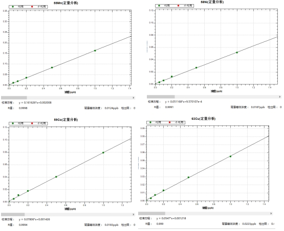 冷焰形式下,绘制各元素0,0.05,0.1,0.2,0.5,1.0μg/L系列浓度标液任务曲线,39K、40Ca、56Fe同等位素的线性相干系数r均大于0.999,背景等效浓度为0.0023μg/L~0.0217μg/L。