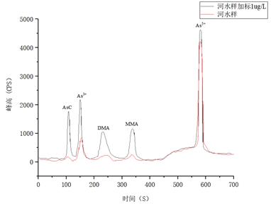 水流样件及加标1µg/L的检验研究成果具体情况见表4,样件及加标后砷形壮合成谱图如图是5如图。