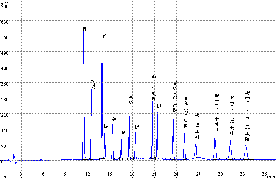 1. 苯 2.甲苯 3.间二甲苯 4.邻二甲苯 5.正十四烷 6.甲苯二异氰酸酯(I)7. 甲苯二异氰酸酯(II)9.己二异氰酸酯 10.异佛尔酮二异氰酸酯(I)11. 异佛尔酮二异氰酸酯(II) 12.二苯丁烷二异氰酸酯