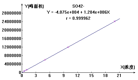 根据硫酸根各浓度点顺次进样,计较其峰面积,以浓度和峰面积绘制规范曲线,线性相干系数为0.99996,成果详见图1。