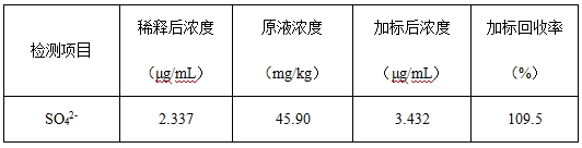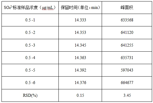 取0.5µg/L硫酸根规范溶液反复进样6次,考查保留时候和峰面积的反复性,RSD成果详见表3。