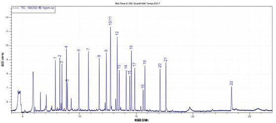 1—α-六(liu)(liu)(liu)(liu)(liu)六(liu)(liu)(liu)(liu)(liu)六(liu)(liu)(liu)(liu)(liu);2—β-六(liu)(liu)(liu)(liu)(liu)六(liu)(liu)(liu)(liu)(liu)六(liu)(liu)(liu)(liu)(liu);3—γ -六(liu)(liu)(liu)(liu)(liu)六(liu)(liu)(liu)(liu)(liu)六(liu)(liu)(liu)(liu)(liu);4—蒽-D10(内标);5—δ-六(liu)(liu)(liu)(liu)(liu)六(liu)(liu)(liu)(liu)(liu)六(liu)(liu)(liu)(liu)(liu);6—七(💃qi)氯(lv)(lv);7—艾(ai)氏(shi)(shi)剂(ji)(ji);8—环氧七(qi)氯(lv)(lv) B;9—γ-氯(lv)(lv)丹(dan);;10—硫(liu)丹(dan) I;11—α-氯(lv)(lv)丹(dan);12—4,4'-DDE;13—狄(di)氏(shi)(shi)剂(ji)(ji); 14—异(yi)(yi)狄(di)氏(shi)(shi)剂(ji)(ji);15—硫(liu)丹(dan) II;16—4,4'- DDD; 17—异(yi)(yi)狄(di)氏(shi)(shi)醛;18—硫(liu)丹(dan)硫(liu)酸酯;19— 4,4'-DDT;20—异(yi)(yi)狄(di)氏(shi)(shi)酮; 21—甲氧 DDT;22—苝-D12(采样替换物)