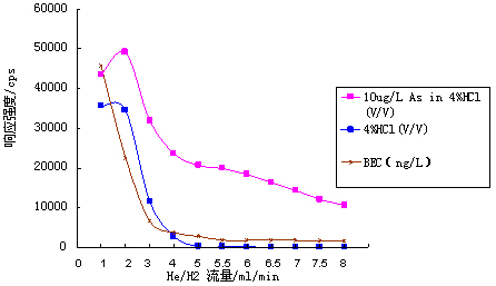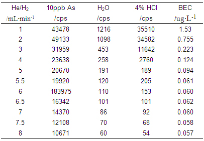 仪器起首在规范形式下停止参数优化(操纵10μg·L﷽-1的Li、Co、In、U、Ce♋调谐液对仪器任务参数停止调理,使仪器活络度高,同时氧化物及双电荷产率小于3%);再开启He/H2碰撞反映气,慢慢增大He/H2流量,测试超纯水、4%HCl及10μg·L-1 As(4%HCl介质)在75amu处的呼应旌旗灯号,计较其背景等效浓度(具体数据见表1及图1);并操纵As标液进一步优化He/H2流量,获得仪器任务参数如表2所示。