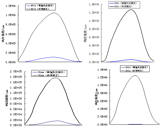 今朝四极杆电感耦合等离子体质谱仪多接纳氩气等离子气,则氩♑原子🍒与基体离子连系构成多原子离子,看待测元素同位素形成搅扰,具体搅扰见表3。设置装备摆设10μg·L-1的Cr(3%HAc介质)、Fe(1%HNO3介质)、As(4%HCl介质)、Se(1%HNO3介质)规范溶液,别离在规范形式及碰撞反映形式下测定其同位素呼应旌旗灯号(图2),尝试成果同时显现56Fe与57Fe呼应强度靠近Fe同位素品貌比,52Cr与53Cr呼应强度靠近Cr同位素品貌比(57As及80Se无适合参考同位素), 由上述可知,ICP-MS 2000E接纳He/H2作为碰撞反映气体,能有用去除氩基相干多原子离子搅扰。