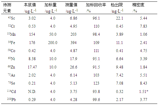 在仪器优化任务参数前提下,对样品溶液及加标样液停止测试,计较其加标收受接管率;对样品空缺溶液平行测定7次,以三倍空缺旌旗灯号规范误差/活络度对应的浓度为检出限;同时对样品溶液平行测定11次(距离ꦐ2min),计较其绝对规范误差,考查精密度,数据见表4。各元素检出限在0.41-22.07ng/L之间,加标收受接管率在93.82%-123.10%之间,精密度在1.06%-8.43%之间。
