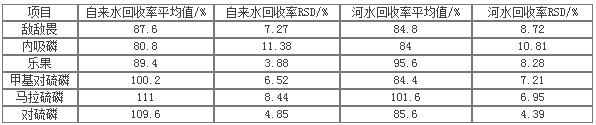 在杭州自来水和江水中干预0.5ug 6种无机物磷混标,离别作四次持平样,按应对试样的体例开始试样前应对,GC-MS 6800测式,得到外标法量,较劲其收受移交率,数剧见下表: